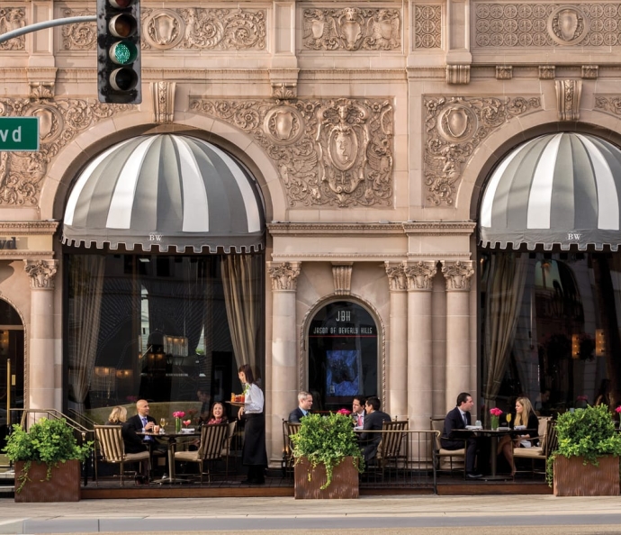 在酒店室外露台上预约一个桌位,即可坐拥比佛利山的绝佳景致。